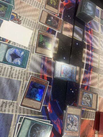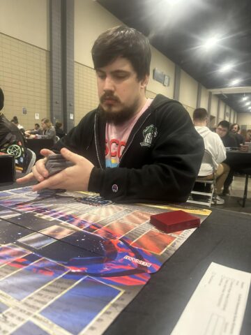 Moore won the die roll and chose to go first! He opened with Radiant Typhoon Fonix, the Great Flame, Ash Blossom & Joyous Spring, Forbidden Droplet, Radiant Typhoon Krosea, and Mystical Space Typhoon. During the Standby Phase, Goldsmith activated the effect of Mulcharmy Purulia, but Moore Chained the effect of Ash Blossom & Joyous Spring! Goldsmith followed up, however, by activating the effect of Mulcharmy Fuwalos. Moore proceeded to the Main Phase, where he Set a card to his backrow, then activated Mystical Space Typhoon, destroying the face-down Droplet. Next, Moore Special Summoned Krosea and activated its effect to search for Mystical Space Typhoon and Radiant Typhoon Eldam from his Deck. He Special Summoned Eldam and searched for Radiant Typhoon Swen, then Special Summoned Swen and searched for Radiant Typhoon Chant. He used Eldam and Swen to Link Summon Radiant Typhoon Varuroon, the Marine Eidolon and search for another Mystical Space Typhoon, then activated Chant, searching for Radiant Typhoon Meghala. This allowed him to activate the effect of Varuroon to place Radiant Typhoon Mandate to his Spell/Trap Zone! Moore used Mandate’s effect to return three Quick-Play Spell Cards, including Radiant Typhoon Chant, to the Deck and drew another copy of Forbidden Droplet. Finally, Moore Special Summoned Meghala, Set three cards to his backrow, and ended his turn.