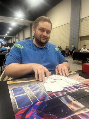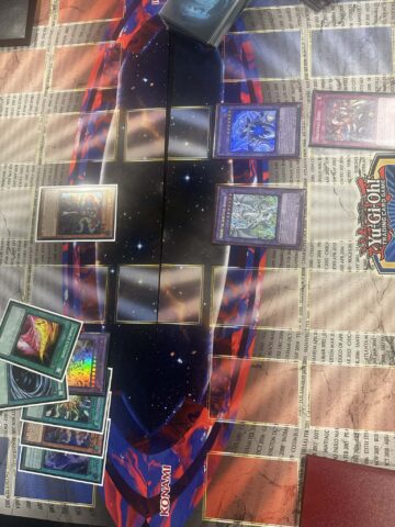 Moore opened with Radiant Typhoon Mandate, Mystical Space Typhoon, Dimensional Fissure, Forbidden Droplet, and Radiant Typhoon Meghala. He Set a card to his backrow, Special Summoned Meghala, then activated Mystical Space Typhoon to destroy his face-down Mandate! Moore used the effect of Meghala to Special Summon Radiant Typhoon Swen from the Deck and Set Mandate back to the field, used Swen’s effect to search for Radiant Typhoon Chant, then activated Chant to search for Radiant Typhoon Eldam. He Special Summoned Eldam and searched for Radiant Typhoon Krosea, then Tributed Swen to Tribute Summon Radiant Typhoon Krosea and search for Mystical Space Typhoon and Radiant Typhoon Ascendance! Next, Moore used Eldam and Krosea to Link Summon Radiant Typhoon Varuroon, the Marine Eidolon and search for another Mystical Space Typhoon, then activated Dimensional Fissure! Finally, he Set 3 cards to his backrow and ended his turn.