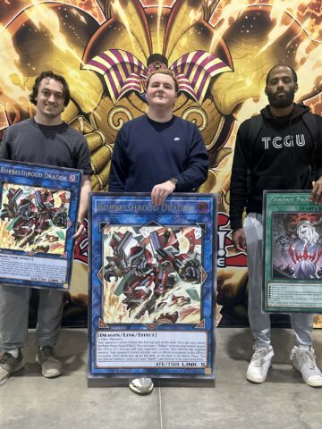 In the center, claiming a GIANTĀ Borrelshroud Dragon is 1st place winner Logan Michael Kite! On the left, we have our 2nd place finisher with an oversizedĀ Borrelshroud Dragon, Pascal Manigat. And on the right, our 3rd place finisher with an oversized Forbidden Crown is Allen Joseph Meyer!
