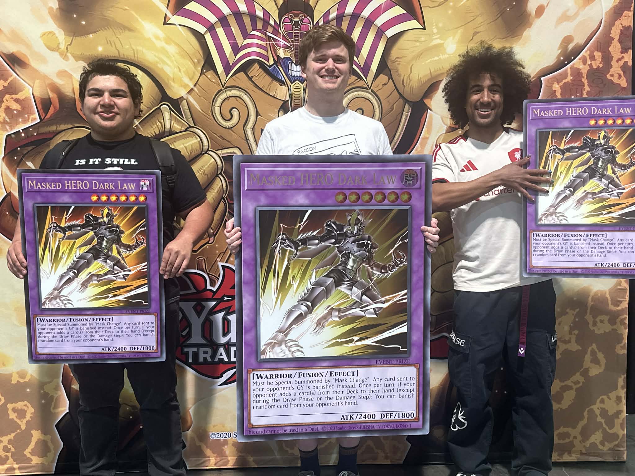 In 1st place, we have Samuel Johanson Jr., who won a GIANT Masked HERO Dark Law! In 2nd place on the left, Esteban Sanchez won an oversized Masked HERO Dark Law. And in 3rd place, Kevin Mills won an oversized Masked HERO Dark Law, as well!