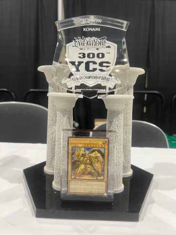 This gorgeous trophy, featuring the 300th YCS logo and an Ultra Rare Anotherverse Stratios in it, is special for this milestone event. It is reserved for this weekend’s best Advanced Format Duelist. Follow the coverage to see which competitor will get to take home the trophy!