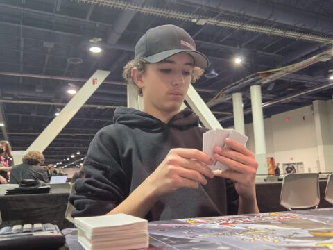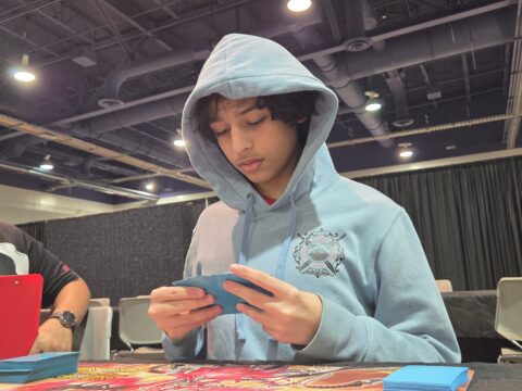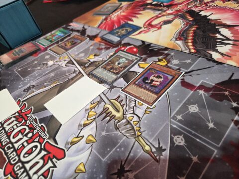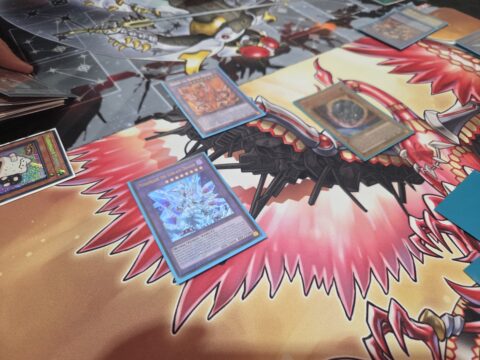 Acroquey let Emmett Special Summon Cupsy☆Yummy from his Deck, which then put another Surprise in his hand. Luis flipped up Ketu, adding Dracotail Lukias to his hand and fusing it with Arthalion for Secreterion Dragon. He used Lukias’s effect, and Emmett Chained Droll & Lock Bird. Lukias put Dracotail Horn on the field. Luis continued, playing Rahu Dracotail to fuse Urgula from his Deck with Incredible Ecclesia, the Virtuous from his hand, into Dracotail Gulamel! Then he Special Summoned Arthalion from the Graveyard, and Gulamel destroyed Cooky★Yummy Way! He used Urgula’s effect to Special Summon Lukias. He then used Secreterion’s effect to Special Summon Incredible Ecclesia. He used its effect to Special Summon Fallen of Albaz, activating its effect – Emmett conceded, about to lose his last monster!