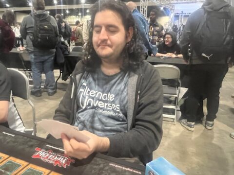 Sevush opened up Duel 2 with Ehther the Heavenly Monarch, Pot of Greed, Pantheism of the Monarchs, The Monarchs Revolt, and The Monarchs Stormforth. He drew Erebus the Underworld Monarch for his turn and then activated Pot of Greed. Singh thought for a while about whether to negate its effect. “Do you want me to explain what the card does?” Sevush jokingly asked. Singh ultimately allowed the effect of Pot of Greed to resolve and Sevush drew Spell Card “Soul Exchange” and Tenacity of the Monarchs with its effect. He activated The Monarchs Stormforth and Singh allowed it to resolve. Sevush activated Pantheism of the Monarchs next by sending Tenacity from his hand to his Graveyard. Sevush drew The Prime Monarch and The Monarchs Masterplan from his Deck. Singh immediately used the effect of D.D. Crow in his hand to banish Pantheism from Sevush’s Graveyard. Sevush activated The Monarchs Masterplan next, sending Strike of the Monarchs from his Deck to his Graveyard. He banished it from his Graveyard to use its effect and make all monsters on the field DARK. Next, he activated The Monarchs Revolt by discarding The Prime Monarch from his hand as a cost. Singh Chained Dracotail Flame to negate the Revolt, return Ketu Dracotail from his Graveyard to his Deck, and draw a card. Next, Sevush banished Masterplan from his Graveyard to Special Summon The Prime Monarch from his Graveyard with its effect. Since Masterplan was banished, he used its effect by targeting Gulamel. Singh Chained Dracotail Horn targeting Gulamel, then Chained Gulamel’s effect to destroy The Prime Monarch. Gulamel returned to the Deck due to Horn’s effect and Singh returned Flame from his Graveyard to his Deck to draw a card. With Gulamel off of the field, Sevush was unable to successfully use the effect of his banished Masterplan. Sevush activated Spell Card “Soul Exchange” next and Tributed both of Singh’s monsters to Summon Erebus. Next, the effect of Spell Card “Soul Exchange” activated as Chain Link 1, and Erebus’s effect activated as Chain Link 2. Singh Chained the effect of Arthalion in his Graveyard, then Chained Dracotail Sting. He banished The Prime Monarch with Sting and returned a Horn from his Graveyard to his Deck to draw a card. Then Arthalion was Special Summoned to the field, and Erebus sent Pantheism and Masterplan from Sevush’s Deck to his Graveyard to return a random card in Singh’s hand to his Deck. Singh couldn’t use the effect of Spell Card “Soul Exchange” to his benefit, and in a new Chain, he activated the effect of D.D. Crow in his hand to banish Pantheism from Sevush’s Graveyard. Sevush ended his turn, clearly behind in the Duel.