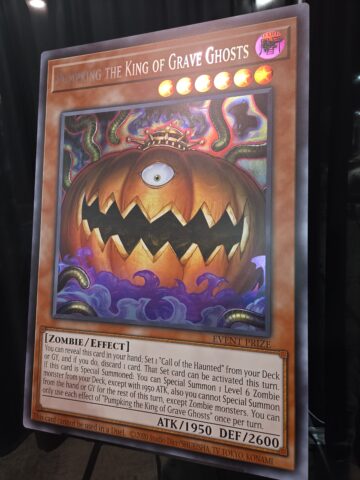 For the two ATTACK OF THE GIANT CARD!! tournaments, we have two options: the ghoulish Pumpking the King of Grave Ghosts, and the mighty Dark Magician of Destruction! Today’s winner will get their choice of the two, and Sunday’s winner will claim the other.